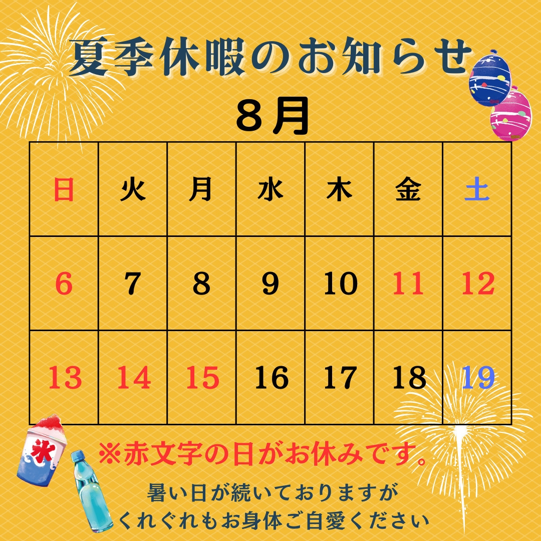 夏季休暇中のお問い合わせ、ご予約はLINE(https://lin.ee/xyZTGK3)からお願いいたします